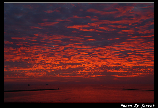 似乎下午的雲都堆在夕陽落下的海平面上了