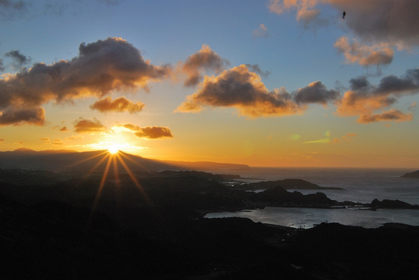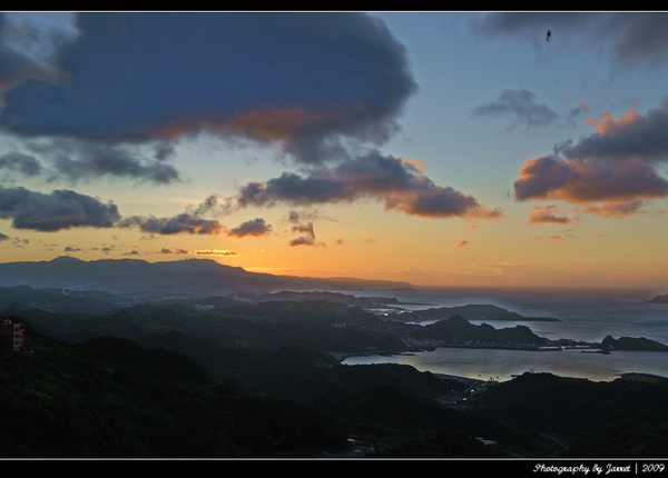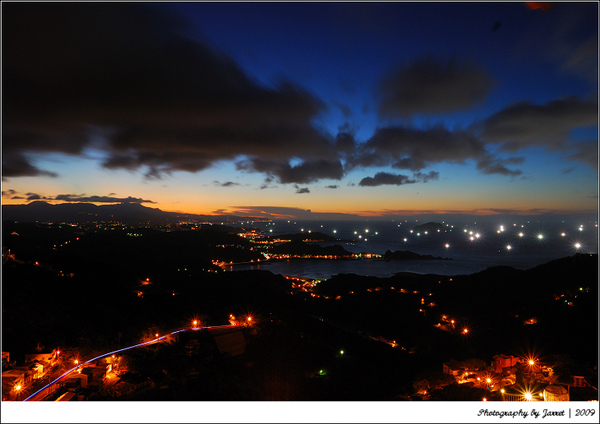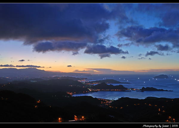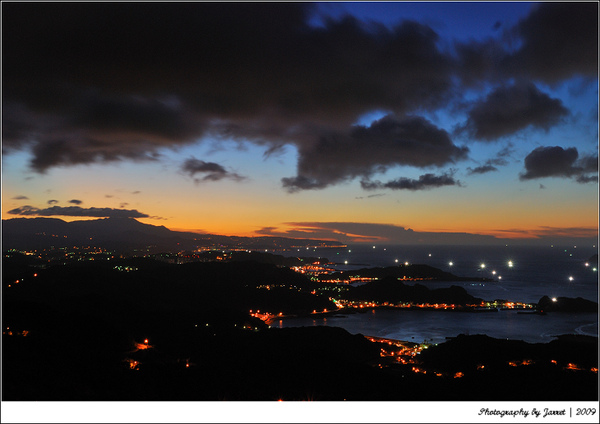 遠處點點漁船的燈火,山城蜿蜒的路燈和車軌,美麗的天光色溫變化,夕陽落日的餘暉