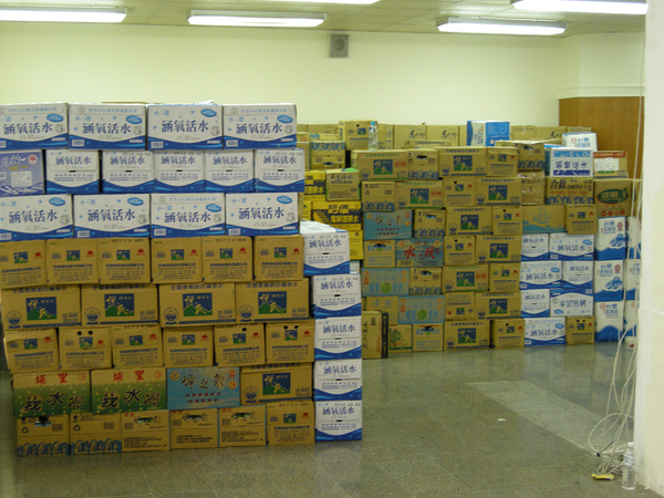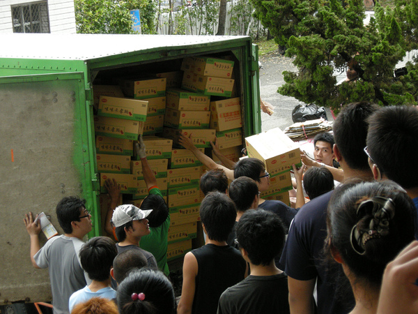大家都搶著幫忙 排成人龍 接力的傳運物資