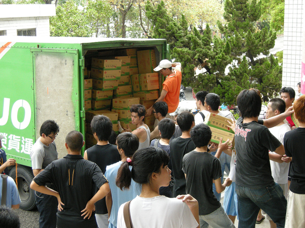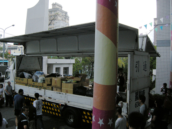 善心的捐贈物資 隨著貨車一輛接著一輛不斷的進到國小