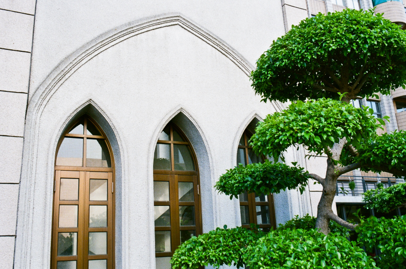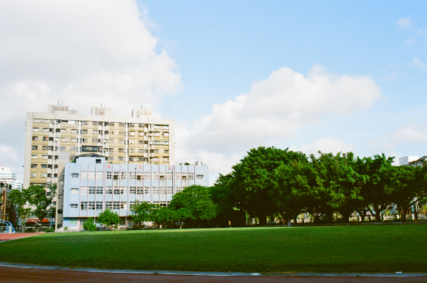 在夏日的午後 校園的建築 綠地 藍天跟白雲