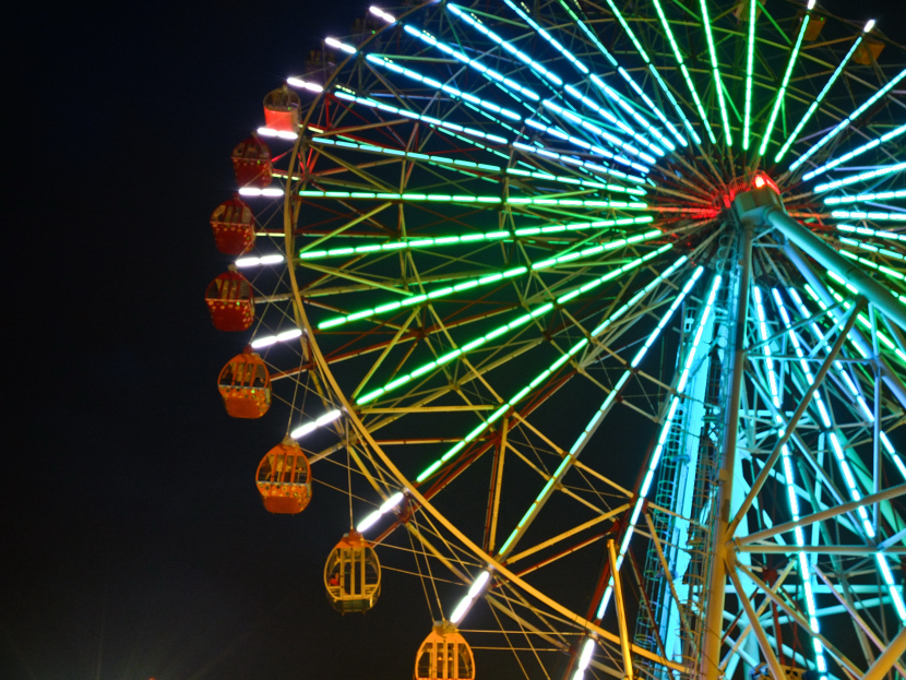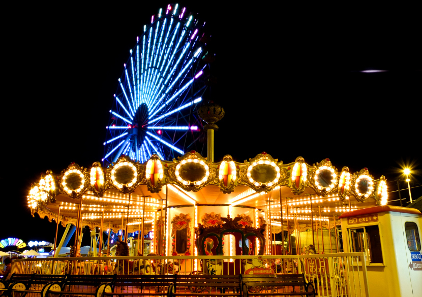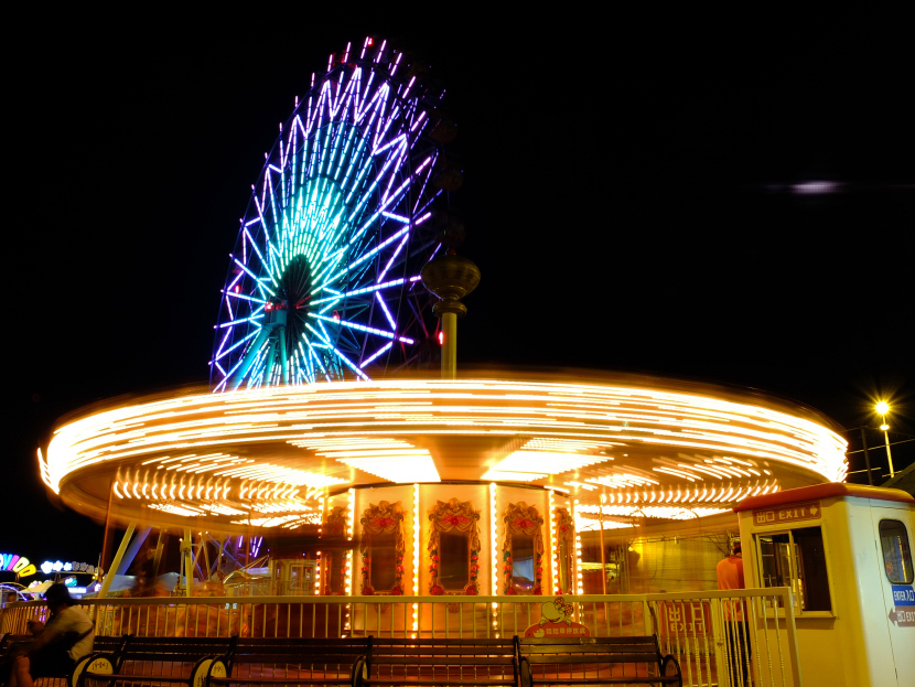 轉動的旋轉木馬跟成為背景的摩天輪